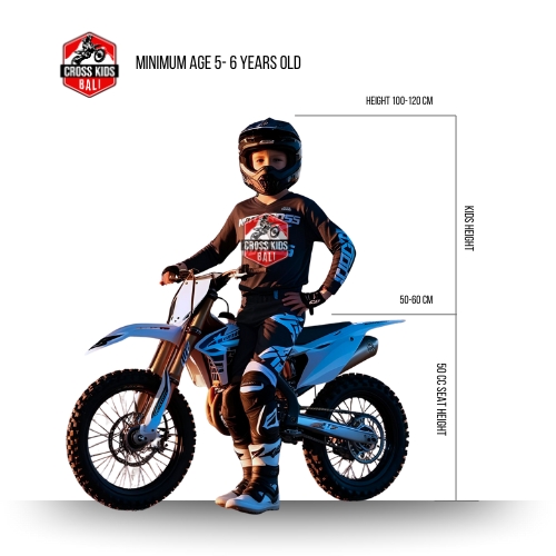 Minimum age is 5-6 years and the height For a 50cc mini motocross with a seat height of about 50-60 cm, children usually need to have a minimum height of about 100 cm to 120 cm. However, this largely depends on the child’s body proportions, especially the length of the inner legs, if not yet enough we suggest ride with our couch for get experience ride motocross.